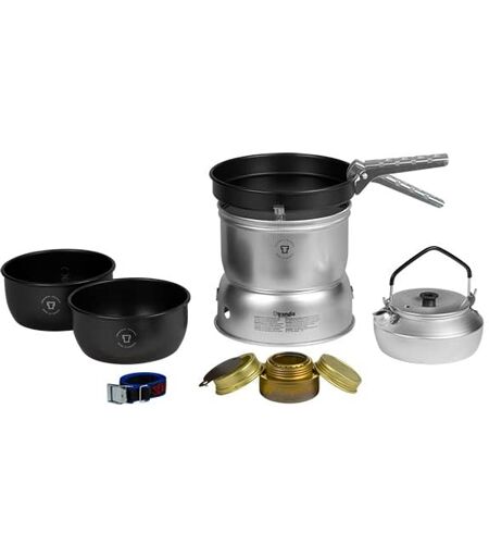 Stormkjøkken 27-6 UL fra Trangia er et kjøkken som passer bra for solo-fottureren eller 2 personer. Kokekarene er mindre og kaffekannen er dimensjonert deretter. Et lite, kompakt kjøkken som krever minimal plass i ryggsekken. Også her er det mulig å supplere med større leirgryter som kan plasseres på de oppfelte holderne i den øvre vindskjermen. Alle kjøkken i 27-serien inneholder to stk. 1 liters gryter, en gradert og en ugradert, en 18 cm stekepanne, vindskjerm (øvre og nedre), brenner, tang og reim. Dimensjonene er 18,5 x 10 cm. Stormkjøkken 27-6 UL er laget av en ny aluminiumslegering, et materiale som er 50 prosent sterkere enn vanlig aluminium. Takket være at materialet er så sterkt, har kjøkkenet blitt tynnere, noe som betyr redusert vekt på mellom 22-25 prosent. Gryter og stekepanne i ultralett aluminium1 Kaffekanne i aluminium2 Non-stick-belagte gryter på 1 liter hver1 Non-stick-belagt stekepanne på 18 cmBrennerTang og reim ...