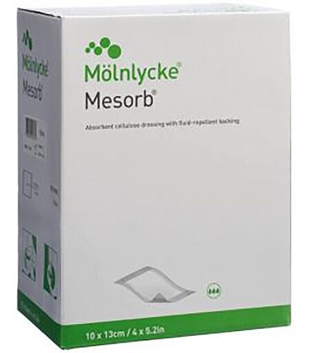 Mesorb er en steril,myk og svært absorberende bandasje som kan holde på store mengder sårvæske. Egner seg til bruk for moderat- til svært væskende sår. Mesorb kan brukes både som bandasje direkte på såret, eller som absorberende bandasje over et sårkontaktlag (feks Mepitel eller Mepilex Transfer) hvis høy absorpsjon er nødvendig. 10 x 15 cm. 50 stk ...