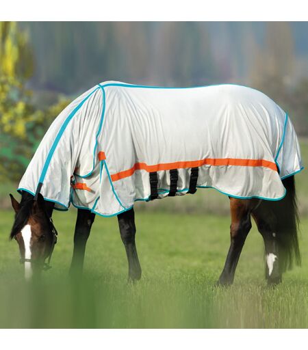Fluedekken i 100% polyester i sølvfarget netting med dekorative rør. Nylon fôret over skulderen og haleklaffen for å forhindre gnagsår. Utstyrt med D-ringer for mulig bensnor. Fast kombinasjonshals som lukkes med borrelås under nakken og nakken. En spenne foran. Ekstra UV-beskyttelse. Mageplate som er festet med solide plastspenner. Maskinvask på maks 40 grader. Kanten kan trekke seg sammen etter vask, så husk å strekke den forsiktig når den er våt. ...
