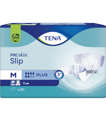 TENA Proskin Slip Plus str M er alt-i-ett-bleier ved tung til svært tung urin- og eller avføringlekkasje, 6/8 dråper, 30 stk. TENA Proskin Slip Plus er en åpen alit-i-ett-bleie som brukes ved tung urin- og eller avføringsinkontinens der ingen andre bleier fungerer optimalt. Bleien har en tekstillignende bakside hvor materialet føles veldig mykt mot huden. Bleien har justerbar borrelås med fire fester/tape som er enkel å feste og justere flere ganger for å oppnå perfekt tilpasning, beskyttelse og komfort. Bleien inneholder en hurtigvirkende og svært absorberende kjerne som gir lekkasjesikkerhet. Bleien har en våtindikator på utsiden som endres fra gul til blå når det er på tide å bytte bleien Tena slip består av Odour Neutralizer som virker luktnøytraliserende ved å redusere effekten av ammoniaklukt. Det gjør at du ikke behøver bekymre deg for uønsket lukt. Str M = Passer til livvidde 73-122 cm. TENA Proskin Slip finnes i ulike absorbsjonsnivåer: Plus, Super og Maxi avhengig hvor stor lekkasjen er. ...