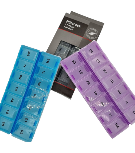 Praktiske pillebokser som er delt inn etter dager og hvor mange ganger du tar piller daglig. Denne har 2 rader slik at du kan legge opp til å ta piller to ganger i løpet av dagen. Trenger du for én eller tre ganger daglig- se relaterte produkter under.Perfekt å ha i hjemmet hvis du tar medisiner jevnlig eller ha med på tur. Størrelse: 185X90X32mm ...