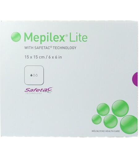 Mepilex Lite er en steril, tynn, absorberende og myk skumbandasje, 15x15 cm, 5 stk. Mepilex Lite er en tynn, skånsom, absorberende skumbandasje som absorberer sårvæske og opprettholder et fuktig sårmiljø. Hefter skånsomt og beskytter såkantene, behagelig for bruker. Kan klippes til og tilpasses ulike sårstørrelser og områder på kroppen. Bandasjen er utviklet for å håndtere en rekke ikke- til lite væskende sår som legg- og fotsår, trykksår, smertefulle sår, traumatiske sår, delhudsbrannsskader, stråleskader og Epidermolysis Bullosa. Mepilex Lite bandasjen sørger for optimale forhold for at såret skal gro. Viktig: Ved tegn på infeksjon, kontakt helsepersonell for passende behandling. ...