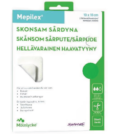 Mepilex Skumbandasje er en steril, myk og fleksibel skumbandasje som sørger for optimale forhold for at såret skal gro. Bruk av Mepilex gir mindre smertfulle bandasjeskift for pasienten. Bandasjen er velegnet til bruk på en rekke type sår som ben- og fotsår, trykksår, blemmer, hudflenger og brannsår. Bandasjen kan ligge på i opptil 7 dager, avhengig av sårets tilstand. Mepilex kan klippes til i ønsket størrelse. Bandasjen må festes med tape eller strømpe. ...
