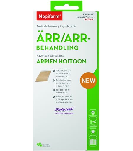 Mepiform er en tynn og diskret silikonbandasje for behandling av både nye og gamle arr. Bandasjen kan også brukes forebyggende på nye sår, men ikke settes på før såret er lukket og evt sting er fjernet. Det kan ta fra 3 måneder opptil et år for å få ønsket effekt på gamle arr, avhengig av hvordan arret er. Ved forebygging av arr bør Mepiform brukes i to til seks måneder. Mepiform bør sitte på 24 timer i døgnet, men det anbefales å ta den av en gang daglig for eksempel i forbindelse med dusjing eller bading. Mepiform er selvheftende og skader ikke huden ved fjerning. Den samme bandasjen kan settes på flere ganger igjen etter at den har vært fjernet. Bandasjen festes på tørr hud uten krem eller salve. Ved behov kan Mepiform klippes til i riktig fasong. Bandasjen er pustende og dusjtett og har UV-beskyttelsesfaktor på 5. ...