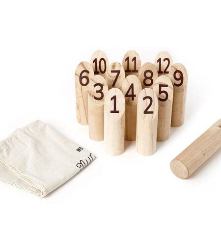 Et morsomt og taktisk utendørsspill bestående av tolv kjegler i form av nummererte treklosser og en kastepinne laget av furu.Målet med spillet er å være den første som oppnår nøyaktig 50 poeng.Spillet kommer i en lerretspose, noe som gjør det enkelt å ta med seg spillet ut.Tydelige instruksjoner for spillet følger med. God sommer :-) ...