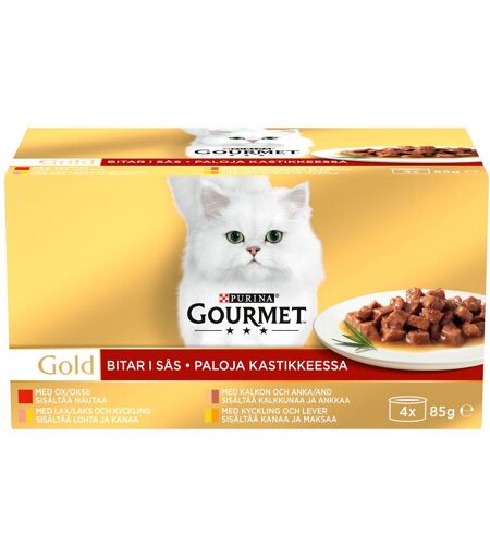 Gourmet Gold Sauce Selection Gourmet Gold Sauce Selection er en praktisk 4-pakning med eksklusivt våtfôr – perfekt for katter som liker variasjon, eller når du er ute etter å finne kattens favorittsmak!En pakke inneholder fire bokser med følgende smaker: Oksekjøtt Kalkun og and Laks og kylling Kylling og lever ...