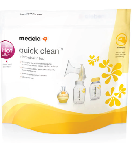 Medela Quick Clean Rengjøringspose desinfiserer ulike ammehjelpemidler som flasker og smokke. Medela Quick Clean Rengjøringspose desinfiserer ulike ammehjelpemidler ved hjelp av vann og mikrobølgeovn. De er enkle å bruke og tar bare 3 minutter i mikrobølgeovnen, noe som gjør denne metoden raskere og enklere enn koking. Damprengjøringen som finner sted i Medela Quick Clean-posen for mikrobølgeovn, dreper 99,9 % av de mest skadelige bakteriene, slik at flaskene, smokkene og brysttraktene blir rene og trygge å bruke igjen. Posene er plassbesparende, enkle å ta med seg og egner seg dermed godt på reise. Hver pose kan brukes 20 ganger. ...
