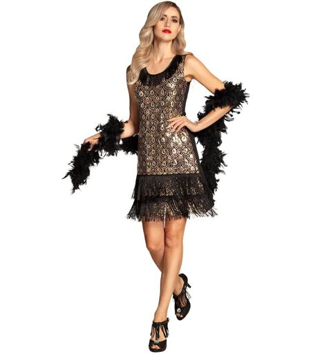 Ta et steg tilbake til 1920-tallets glamour med Flapper Peacock kostyme. Denne elegante kjolen i svart og gull er dekorert med paljetter i påfuglinspirert mønster og avsluttes med lekre frynser som danser med bevegelsene dine. Perfekt til Gatsby-fest, temafest, karneval eller andre anledninger hvor du vil skinne på dansegulvet. Kjolen har ermeløst snitt og en figurnær passform som fremhever silhuetten. Den er komfortabel å bruke og enkel å kombinere med tilbehør som fjærboa, hårbånd og lange hansker for et komplett 20-talls uttrykk. ...
