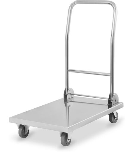 Transportvognen RCFT-1.1 fra Royal Catering kan effektivt frakte et bredt utvalg av ting, varer eller pakker, og er først og fremst designet for tung belastning. Takket være den solide konstruksjonen, er vognen det ideelle valget for hotell, butikker og varehus. Transportvognen vil også passe til catering, levering eller budtjenester. Enten du ønsker å frakte kofferter, pakker eller grønnsakskasser, har denne rustfrie stålvognen med en generøs overflate på 82 x 52 cm nok plass til både store og små gjenstander. Siden overflaten ikke er begrenset av opphøyde kanter, kan selv overhengende gjenstander lett transporteres. I tillegg, med en høy vektkapasitet på opptil 400 kg trenger du ikke å bekymre deg når du legger på gjenstander. Effektivitet og komfort er nøkkelord når det gjelder transport av alle slags varer med denne praktiske vognen. Transportvognen imponerer med dens høye stabilitet og robusthet. Både strukturen og transportoverflaten er laget av rustfritt stål, noe som garanterer den høyeste kvaliteten og holdbarheten. Vognen viser knapt tegn på slitasje selv etter langvarig bruk. Royal Catering-transportvognen står for mobilitet: Med sine høykvalitetshjul, de kompakte dimensjonene og den robuste konstruksjonen i rustfritt stål, kan du transportere varene dine trygt og komfortabelt. Etter at du er ferdig med å jobbe, kan du enkelt brette sammen det innebygde håndtaket. Dermed blir selv vognen lett å lagre og transportere. De fire store 360° roterbare hjulene er laget av høykvalitets termoplastisk gummi. De absorberer vibrasjoner og støt forårsaket av ytre påvirkninger og garanterer dermed spesielt rolig transport . Hjulmaterialet er egnet for et bredt utvalg av gulv og etterlater ikke merker eller skader. Selv på kjølige flater, slik som i kjølerom, er det en lek å manøvrere vognen. Med denne vognen er det ingen fare for personskader: Alle hjørnene er praktisk avrundet. På samme måte sikrer den stabile materialbehandlingen at selv tunge gjennstander kan transporteres uten risiko. I tillegg, takket være det kompakte designet, kan vognen brukes i trange rom med liten plass for manøvrering. ...