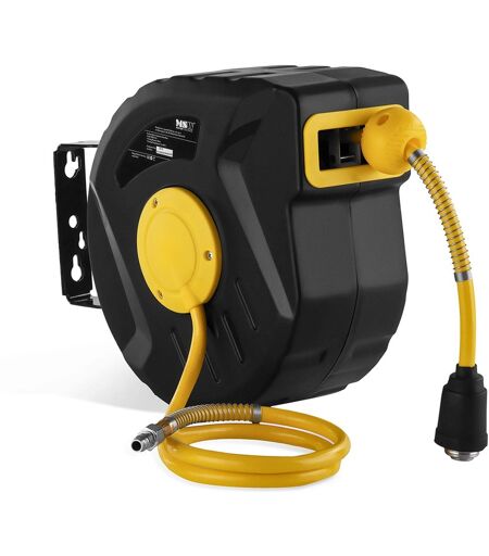 Bruk PRO-A 10 uttrekkbar slangetrommel for å utvide slangen opptil ti meter fra trykkluftforsyningen, for eksempel mellom luftkompressor og mottaker. Uansett om du arbeider på huset, i hagen eller i et verksted med verktøyene fra MSW, finner alle håndverkere og gjør-det-selv-entusiaster det riktige verktøyet. Forvridde kompressorslanger og ubekvemt opptrekk hører fra nå av fortiden til. Den automatiske tilbaketrekningen av slangetrommelen hjelper deg å holde alt ryddig. På grunn av den smarte konstruksjonen, blir slangen lagt lag på lag når den beveger seg inn. Når du trekker ut slangen, klikker trommelen på plass to til tre ganger per meter, slik at du alltid kan trekke ut eksakt den lengden du ønsker. Den uttrekkbare slangetrommelen en et viktig verktøy når du arbeider med trykkluftverktøy, og den kan ha et trykk på opptil 24 bar. Økt rekkevidde og større mobilitet kan oppnås med luftslangen på ytterligere ti meter. Slangetrommelen har fleksibel rotasjon på 180°. Slangetrommelen kan enkelt monteres i taket eller på en vegg.. Det nødvendige monteringsutstyret er inkludert i leveransen. Trommelen sørger for arbeidssikkerhet. Den ti meter lange luftslangen oppbevares trygt i det lukkede plasthuset og er beskyttet mot slitasje. ...