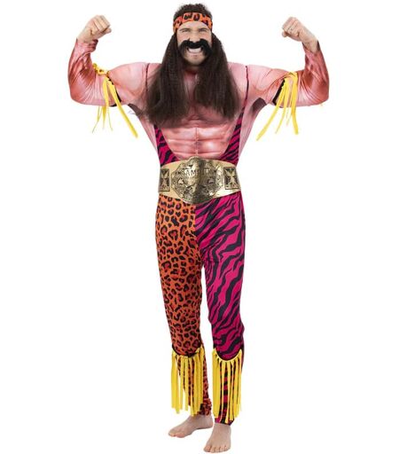 Gjør deg klar for ringen med dette fargerike wrestler-kostymet! Perfekt til karneval, temafester eller utkledningskvelder hvor du vil være kveldens superstjerne. Kostymet består av en heldrakt i sterke farger og dyremønster med innebygd muskelbryst for ekstra effekt. Tilbehør som pannebånd følger med, og de gule frynsene på armer og ben gir antrekket en autentisk wrestler-stil. Kostymet finnes i størrelsene M, L og XL. En morsom og iøynefallende drakt som garantert gir deg oppmerksomhet på festen. Ta på deg kostymet, vis musklene og gjør deg klar for show! ...