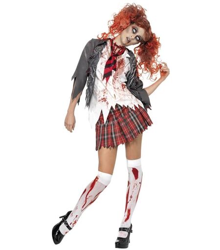 Klare for å skremme vettet av alle på Halloweenfesten? Da er vårt Zombie Skolejente-kostyme til damer det perfekte valget! Dette kostymet kombinerer en perfekt balanse av sexy og skummel. Med en hjernespisende zombie-twist vil du virkelig sette standarden for Halloween-kostymer. Vår Zombie Skolejente-kostyme vil få deg til å se utrolig kul og skremmende ut samtidig. Kostymet inneholder en jakke med en påsydd bluse i grått og hvitt, som er dekket i realistiske blodflekker. I tillegg får du et utsvingt slips med røde og svarte striper for å legge til ekstra detaljer. Det medfølger også et kort skjørt med en taggete bunnkant og rutemønster i svart, hvitt og rødt. Bli festens ultimate zombie-skolejente med vårt Zombie Skolejente-kostyme. Klar for å skape skrekkblandet fryd? ...